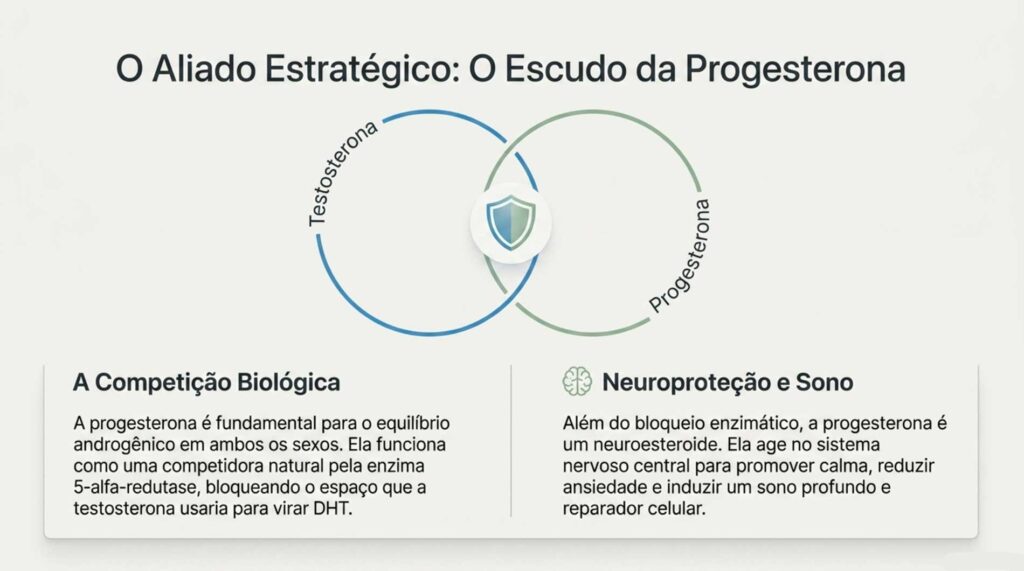 Tanto em homens quanto em mulheres, a progesterona é essencial para o equilíbrio androgênico. Ela funciona como uma competidora natural da testosterona pela enzima 5-alfa-redutase: quando seus níveis estão adequados, ela inibe a enzima e impede a conversão excessiva em DHT. Por isso, a progesterona é uma excelente aliada ao Saw Palmetto em estratégias integradas de modulação hormonal.