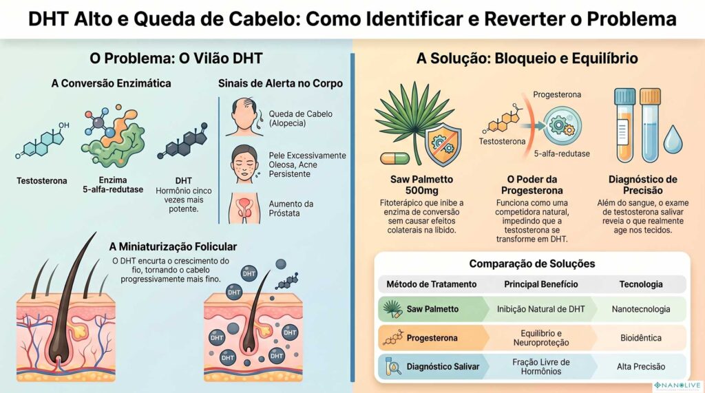 • A origem do problema: o excesso de DHT — derivado da conversão da testosterona pela enzima 5-alfa-redutase — é o principal causador da queda de cabelo, acne severa e aumento da próstata.