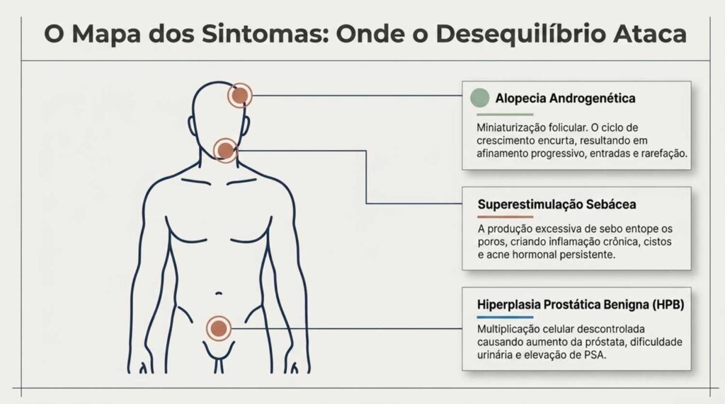 Na próstata, o acúmulo de DHT estimula a multiplicação das células prostáticas. Com o passar dos anos, isso leva à Hiperplasia Prostática Benigna (HPB), causando dificuldade para urinar, aumento da frequência urinária noturna e elevação nos níveis de PSA.
