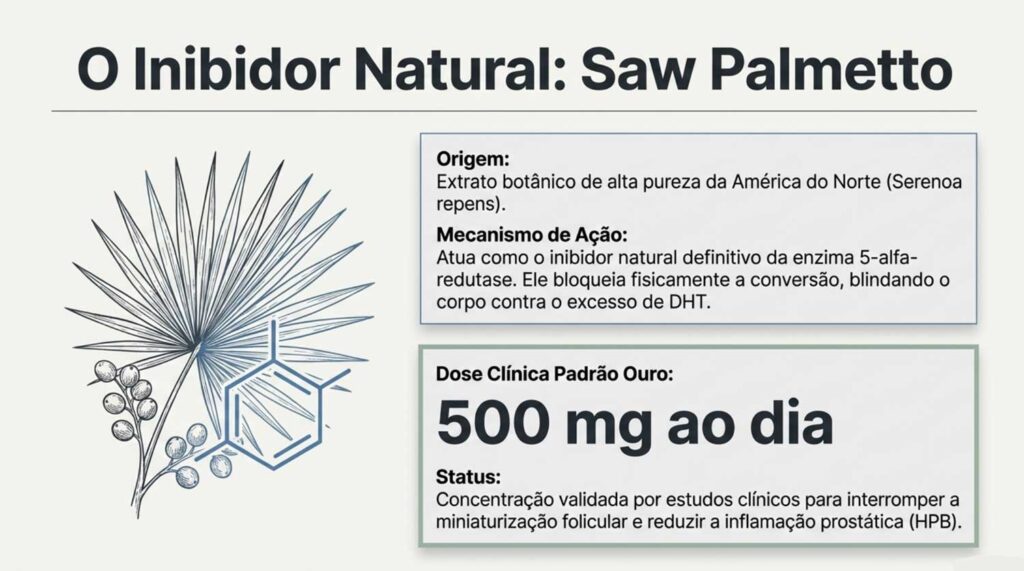 • Solução fitoterápica: o Saw Palmetto é um inibidor natural da 5-alfa-redutase, altamente eficaz para reverter sintomas sem causar perda de libido.