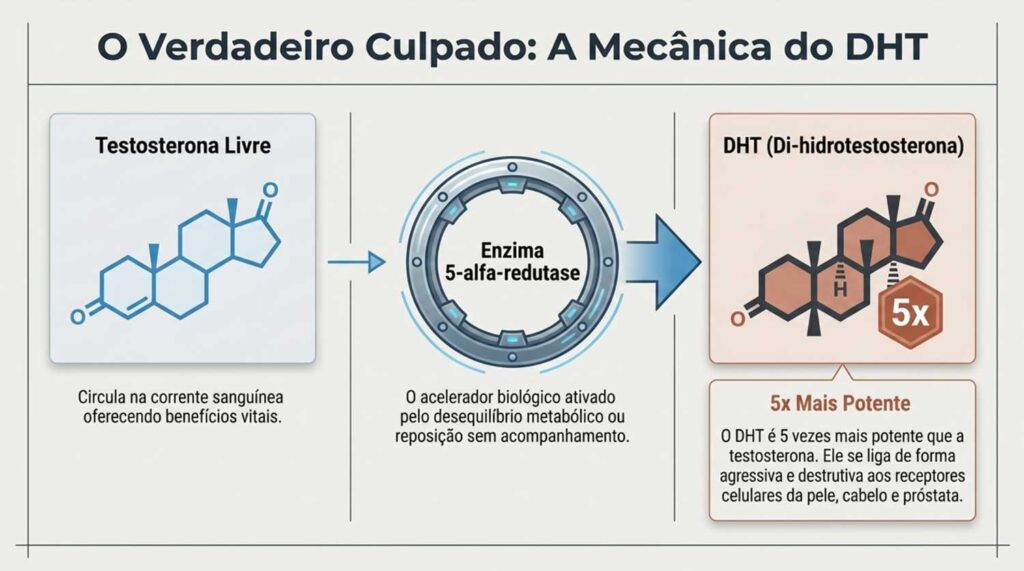 Trata-se de um processo biológico natural de regulação hormonal. O problema surge quando há um desequilíbrio metabólico ou quando se inicia uma reposição de testosterona sem acompanhamento especializado. Nessa situação, o organismo — tentando administrar a nova carga hormonal — acelera a atividade da enzima 5-alfa-redutase, provocando um pico de DHT e desencadeando efeitos colaterais severos.