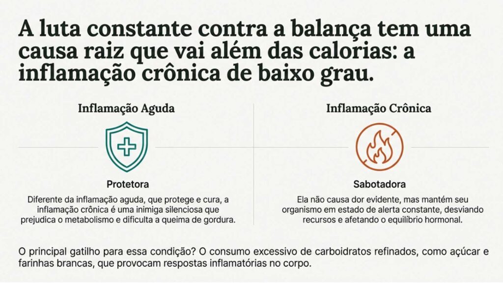 A inflamação crônica não age como a inflamação aguda (que protege). Quando persistente, ela compromete o metabolismo, provoca resistência hormonal e torna mais difícil a queima de gordura. Ao reduzir carboidratos refinados e ajustar a ingestão de macronutrientes, é possível estabilizar os níveis de glicose, diminuir marcadores inflamatórios e favorecer a perda de gordura corporal de forma segura.