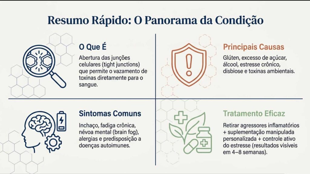 | Principais causas | Glúten, açúcar, álcool, estresse, disbiose e toxinas ambientais. |