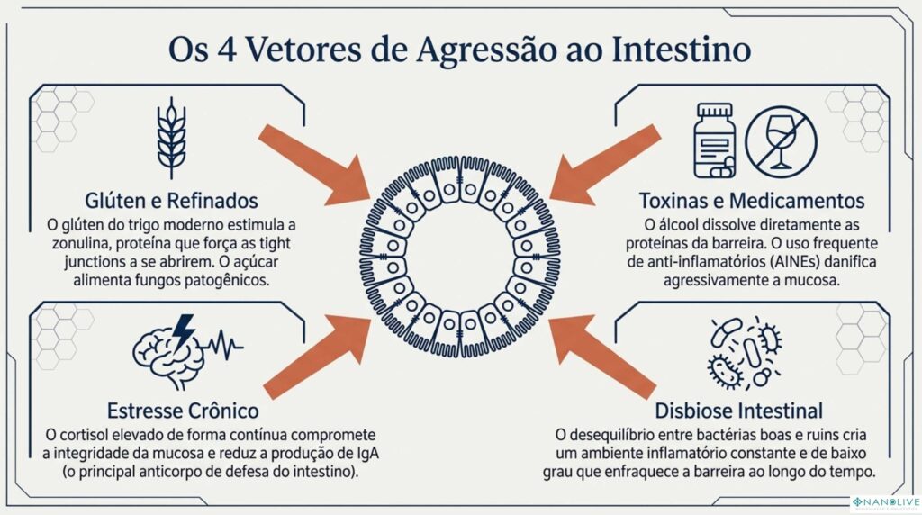 O glúten presente no trigo moderno representa um dos maiores agressores da mucosa intestinal. Estudos demonstram que o glúten estimula a produção de zonulina, uma proteína que sinaliza para as tight junctions que elas devem se abrir. Consequentemente, mesmo pessoas sem diagnóstico de doença celíaca podem ter a barreira intestinal comprometida pela ingestão regular de glúten.