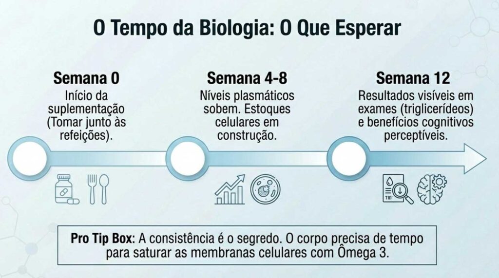 A consistência é a chave. Os benefícios do ômega 3 costumam se manifestar com uso contínuo entre 4 e 12 semanas, dependendo do objetivo. Para redução de triglicerídeos, melhorias são observáveis em exames após 8 a 12 semanas de suplementação regular. Para suporte cognitivo e emocional, os primeiros sinais costumam aparecer entre 8 e 12 semanas de uso diário.
